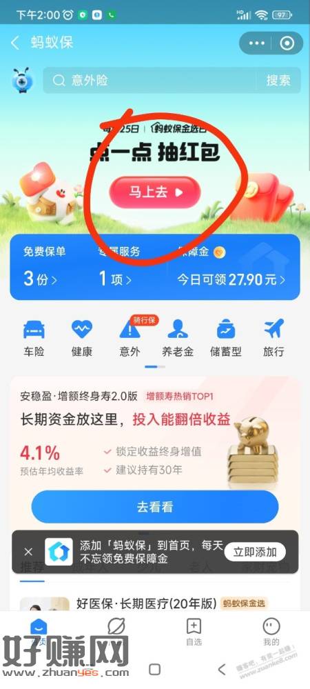 支付宝20元门诊险体验金+消费红包