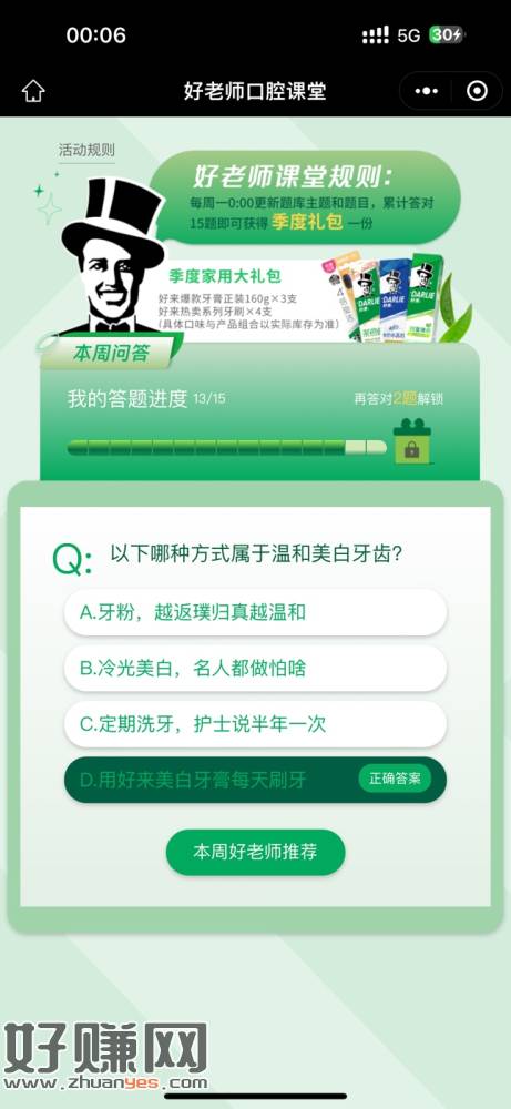 微信打开地址->每周1一道题目,连续答对15周领黑人牙膏礼包