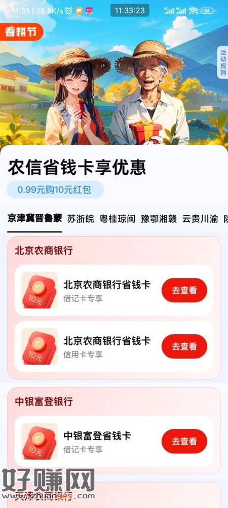2、支付宝搜 春耕日 ,可0.99购买10元省钱卡(需绑定农商行的卡)