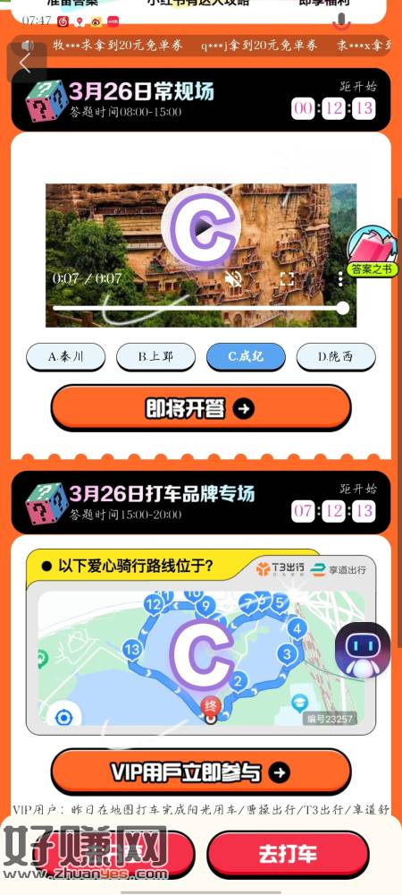 百度地图APP搜索“打车预言家”->选择答案答题得5~30亓打车券,券仅限当天可用