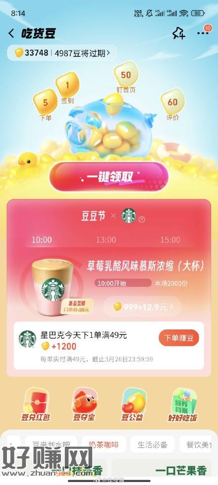 饿了么吃货豆,今天10点13点15点有999豆+12.9兑换星巴克咖啡