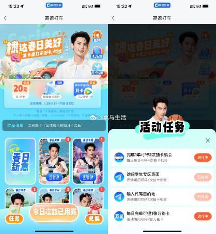 【高德集卡得20元打车券或会员】高德地图APP搜索“王鹤棣集卡”->集齐6张卡合成,目前集齐可得腾讯视频会员月卡(或累计26张卡片直接兑换)