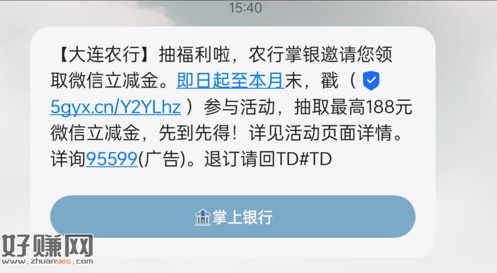 【大连农行】抽福利啦,农行掌银邀请您领取微信立减金。即日起至本月末,戳( 5gyx.cn/Y2YLhz )参与活动,抽取最高188元微信立减金,先到先得!详见活动页面详情。详询95599(广告)。退订请回TD#TD