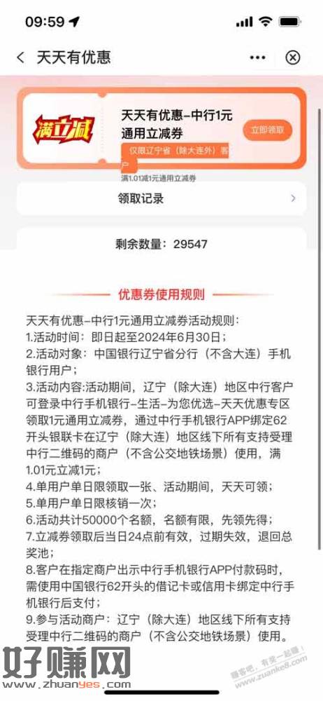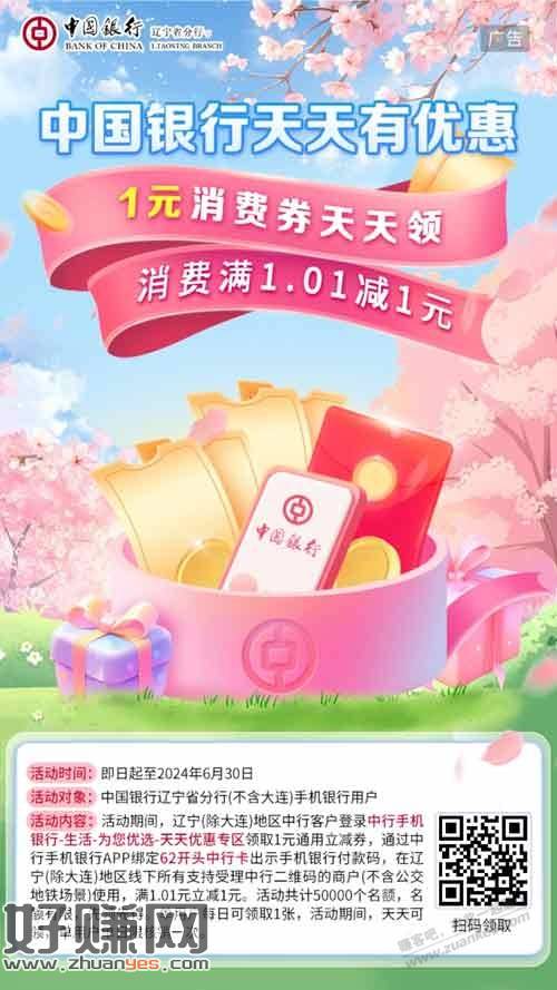 中行辽宁 每天1元消费券 也不知道能挺到哪天