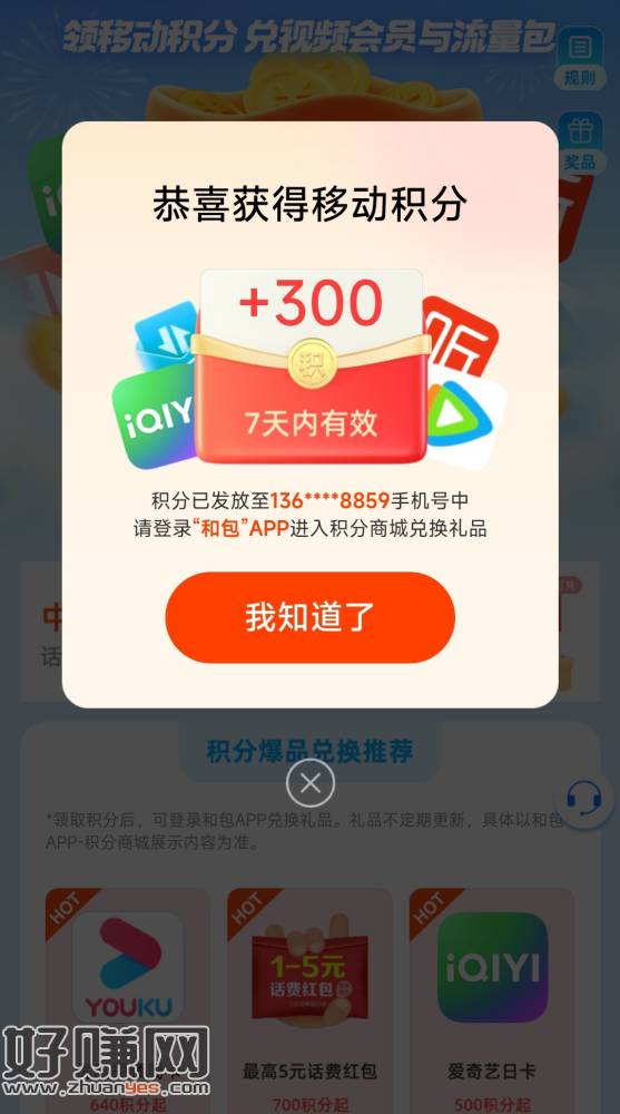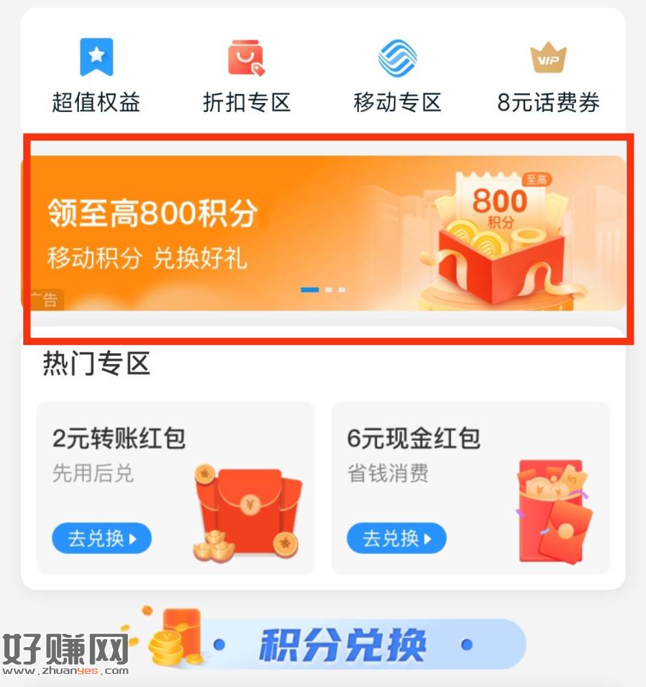 支付宝搜索“中国移动和包”,进入小程序,点击中间横幅广告“领至高800积分,有300积分。
