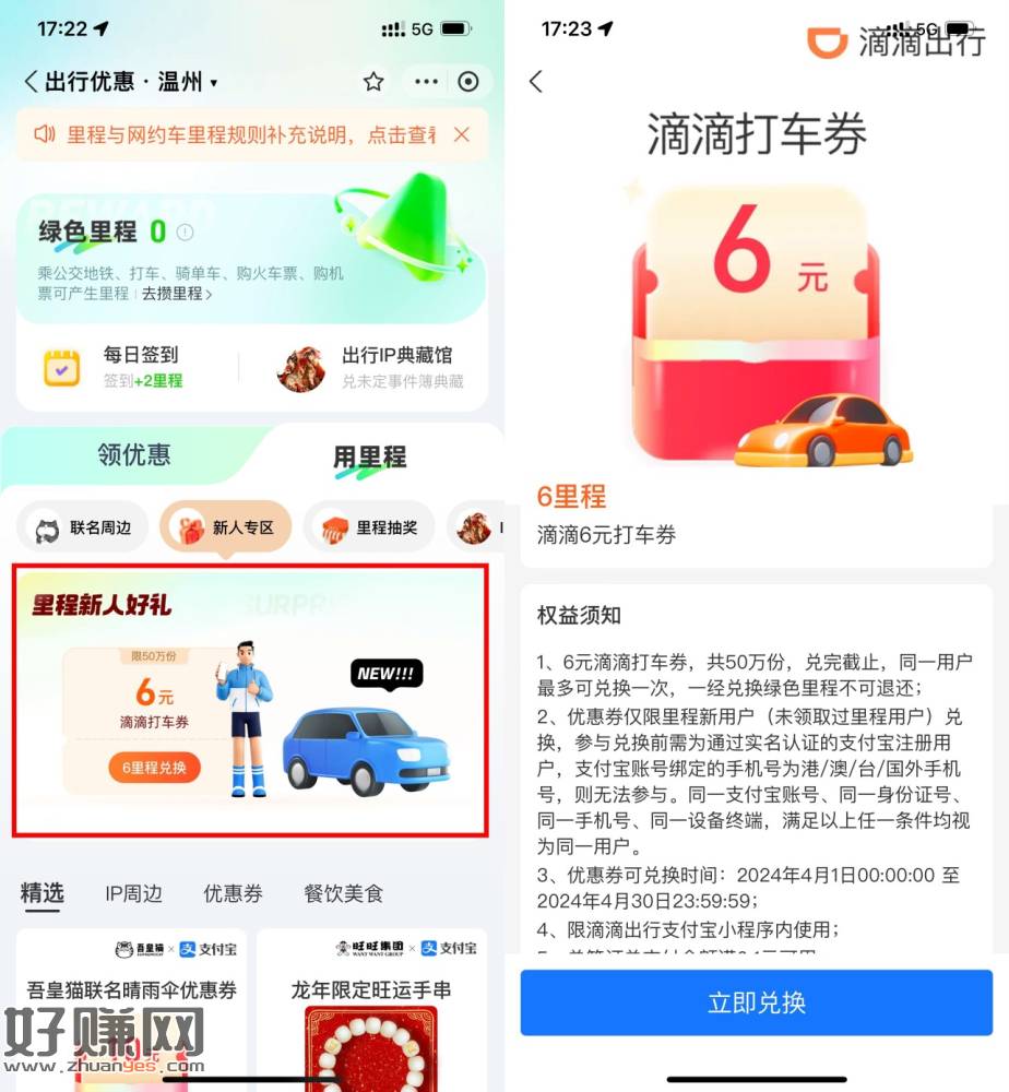支付宝里程兑6元滴滴打车券