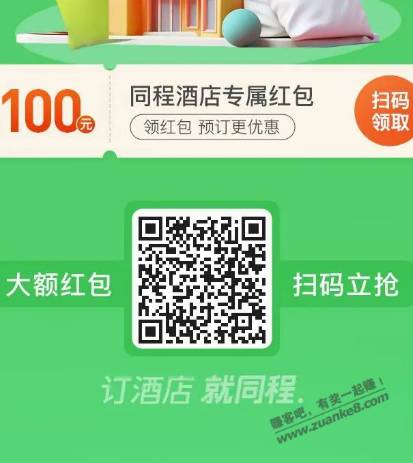 1、微信扫码,同程酒店券,最高100元,有效期7天: