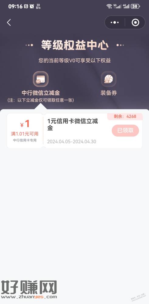 中行能量驿站等级权益1元