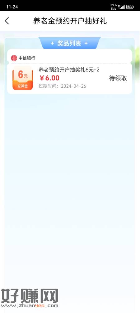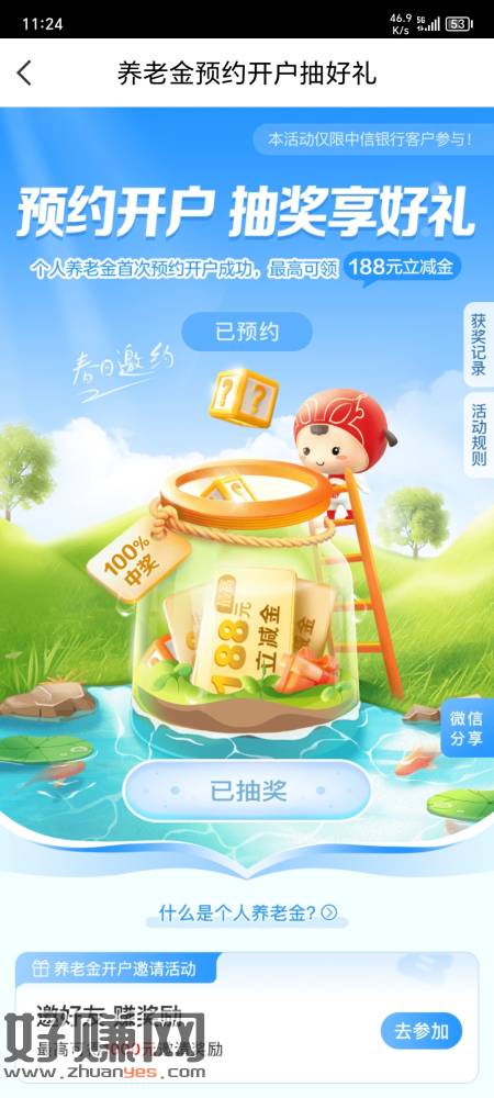 中信银行预约养老金开户,最高抽188,亲测抽到6