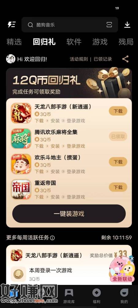 应用宝”->首页->顶部->“回归礼” 部分人刷新了,有任务