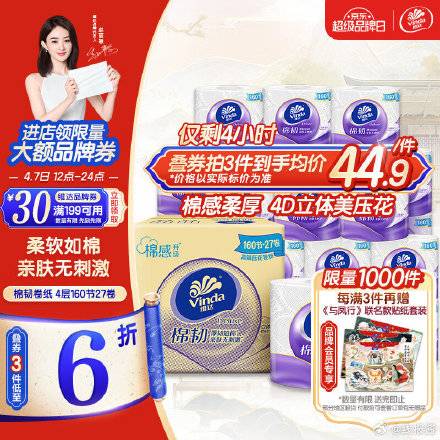 维达 棉韧立体美有芯卷纸 160节*27卷
