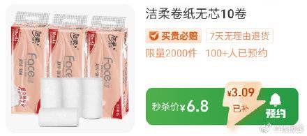 14点,百亿补贴6.8亓 ,洁柔卷纸4层无芯卷筒10卷,