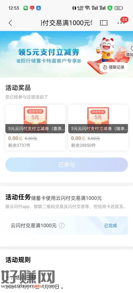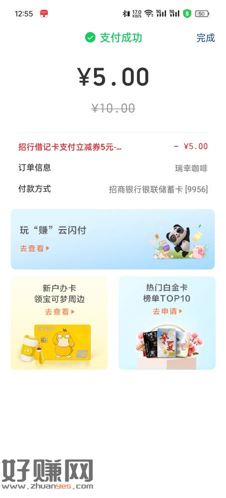 小毛2.8 ysf用招行卡转账1000完成领5元瑞幸券 然后