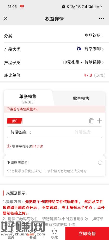 小毛2.8 ysf用招行卡转账1000完成领5元瑞幸券 然后旧版本瑞幸买10礼品卡卖掉 嫌麻烦就自己点咖啡喝了