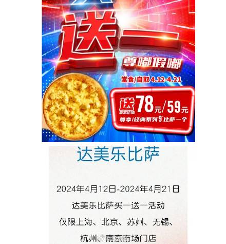 达美乐限制上海北京苏州杭州无锡南京地区,部分门店即日起有买一送一,要是能叠加建行生活券,估计更合适,自测