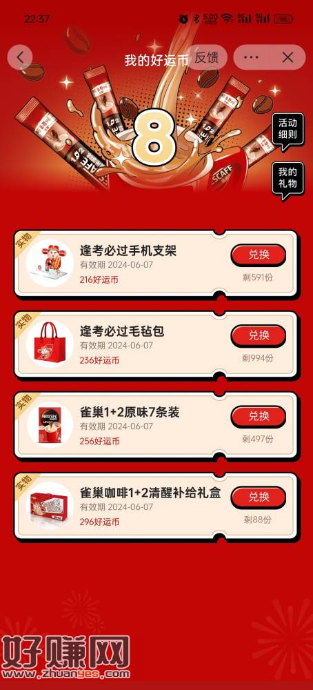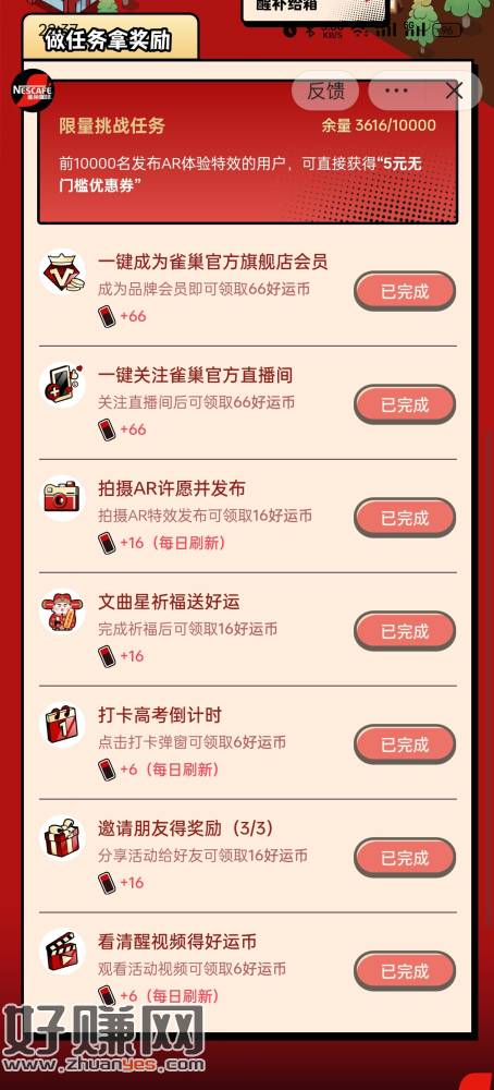 雀巢免费手机支架 抖音搜图一 点进去任务做完 假分三次不用拉人 然后点右上角好运币 兑换
