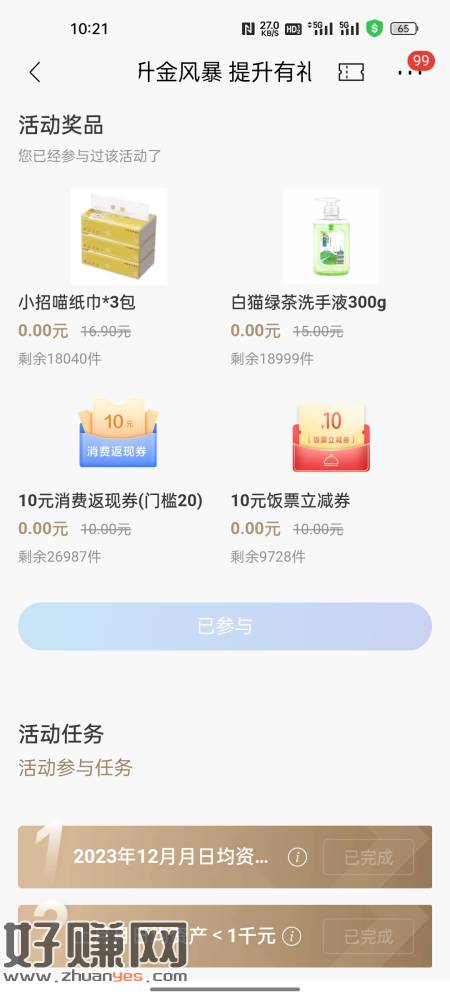 招商银行升金风暴,1000元领10元消费返现,今天转去入10