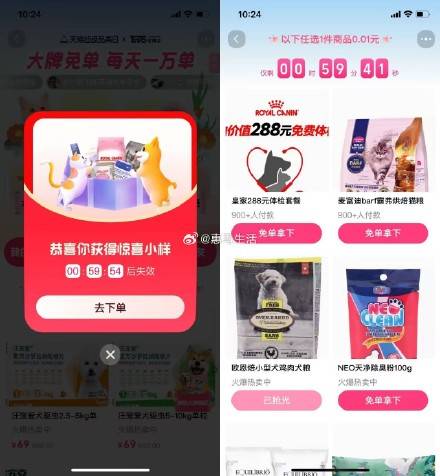 淘宝app搜索“宠物大牌免单”->4月11日~14日每天3次机会抽宠物用品免单,不中就换号试下