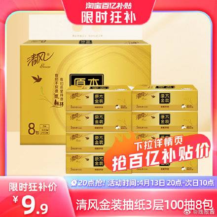 百亿补贴9.9亓 ,清风纸巾抽纸金装3层100抽8包
