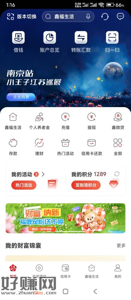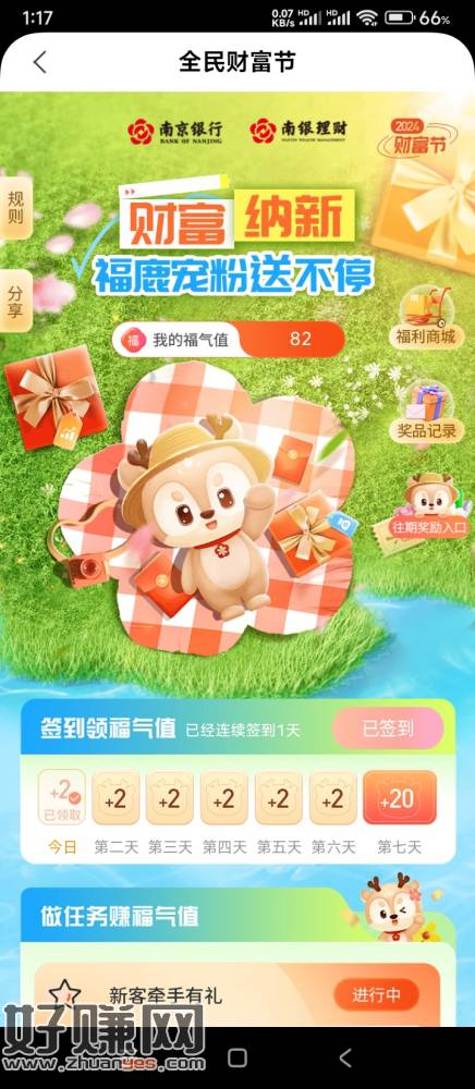 南京银行app首页中间滚动横幅,财富纳新活动新一期,可每天签