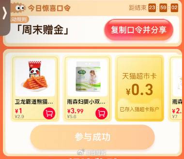 今日猫超右下角惊喜口令【周末赠金】翻牌可领猫超卡‼试试手气!