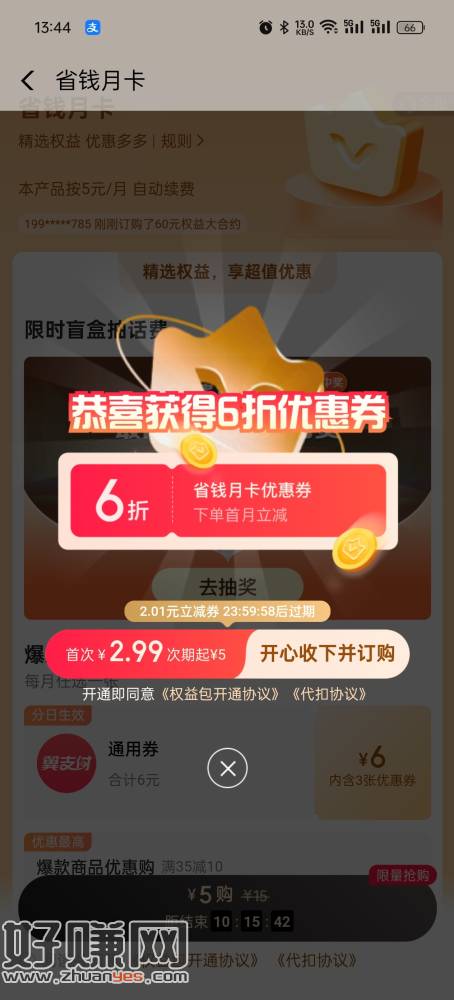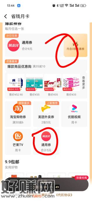 跟早上发的差不多 另外一个 翼支付-权益更多 有个5元省钱月卡包 进去过会退出弹券 可3块块开通 可选10-2*3(一周一张) 或者10-5*1明天生效 vx收款码无损
