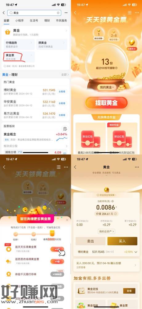 支付宝黄金票每天可以做做任务,满100份可以提现成黄金