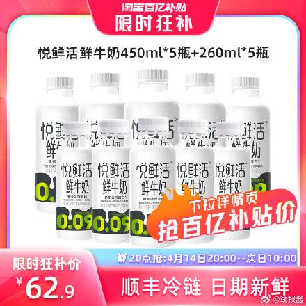 百亿补贴62.9亓, ,悦鲜活鲜牛奶450ml*5瓶