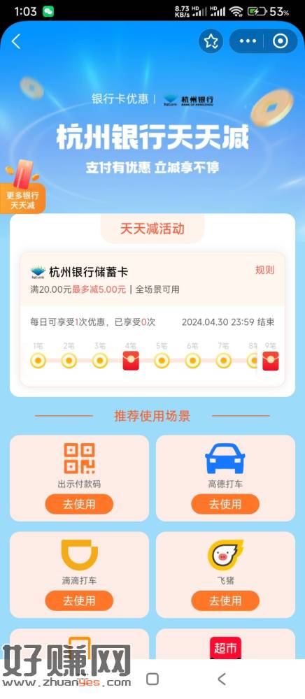 支付宝,银行卡有优惠,杭州银行4月15日起新活动20随机天天减,直接深圳通无损t