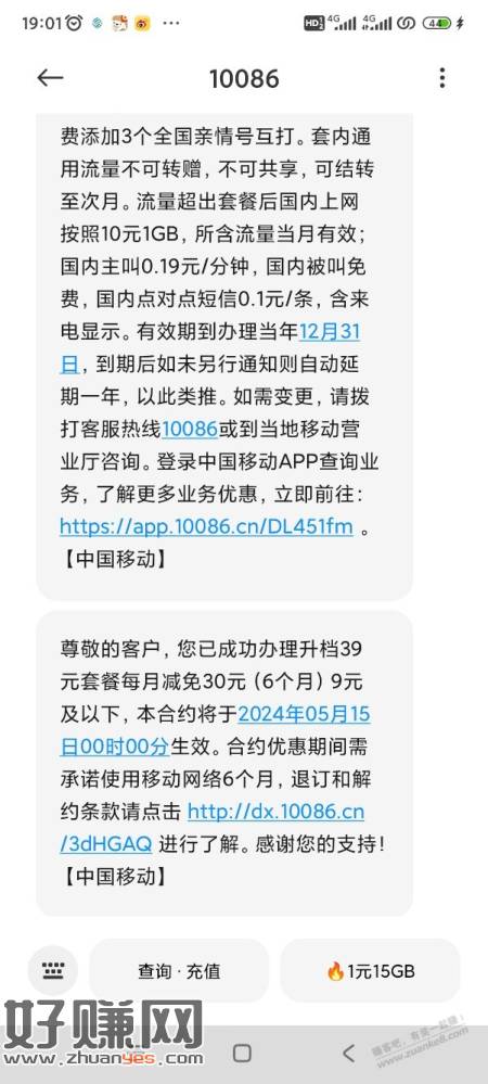 【中国移动】暖春优惠,为感谢您的支持,2024年4月30日前可拨打10086咨询套餐优惠,9元体验39元全家享套餐(优惠期6个月,到期后恢复正常资费39元/月,优惠期内请保持使用移动网络和39元及以上套餐),升级后套餐每月含5GB国内通用流量、50分钟国内通话。以上资费不含港澳台地区。优惠详情请点击 https://dx.10086.cn/Mc39sD30 了解。温馨提醒优惠限收到本短信的客户办理,转发无效。如无需接收此类短信,请回复R退订。到期前取消就行了。
