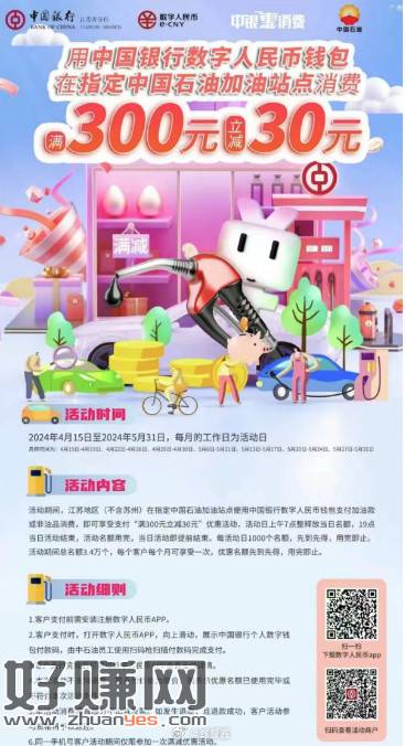 截止5.31,每周工作日,江苏地区,中行数字人民币中石油加油有300-30