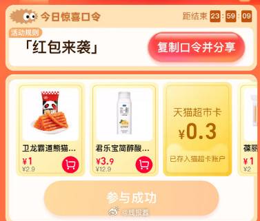 今日猫超右下角惊喜口令【红包来袭】翻牌可领猫超卡