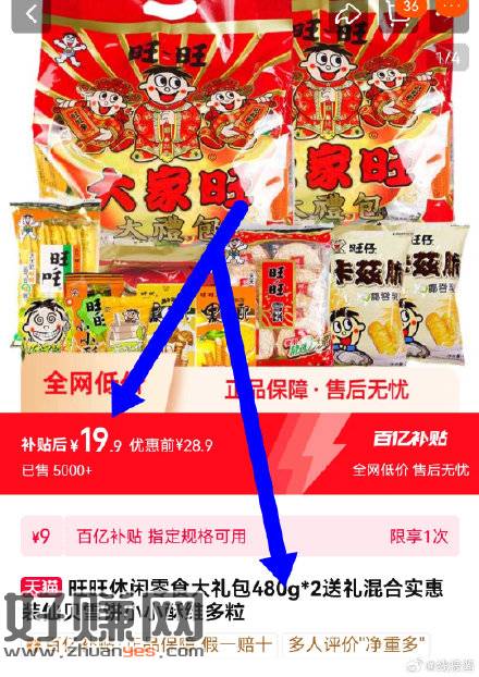 百亿补贴,19.9亓, ,旺旺休闲零食大礼包480g*2份