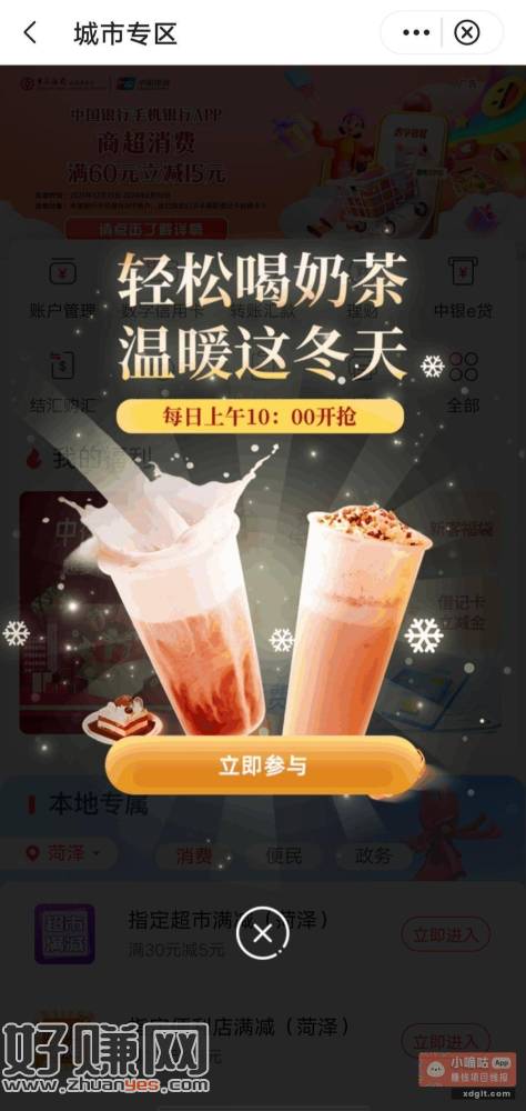 中国银行山东,城市专区-聚汇日饮品节,领5-10立减金,选瑞幸可以直接领四次,去小程序买现金卡抵扣,去闲鱼出保底10几毛。
