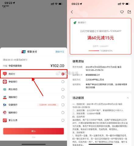 【12306使用邮储支付满60减15元】12306购买火车动车票,使用云闪付的邮储支付,满60立减15元,每天名额有限 有看见立减再买