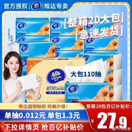 百亿卟贴,27.9亓 ,维达超韧抽纸110抽*20包整箱