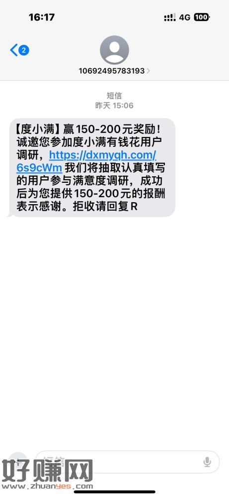 收到这个短信的去报名,第二天会打电话给你调查,就跟他吹牛皮就行了,注意不要吹破了,二百大元七个工作日到度小满金融卡包里面。