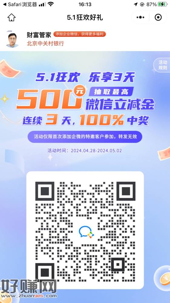 【北京中关村银行】5.1狂欢节,连续3天,抽取最高500元微信立减金,100%中奖
