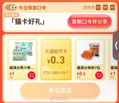 1、今天猫超口令是【猫卡好礼】翻牌可领猫超卡
