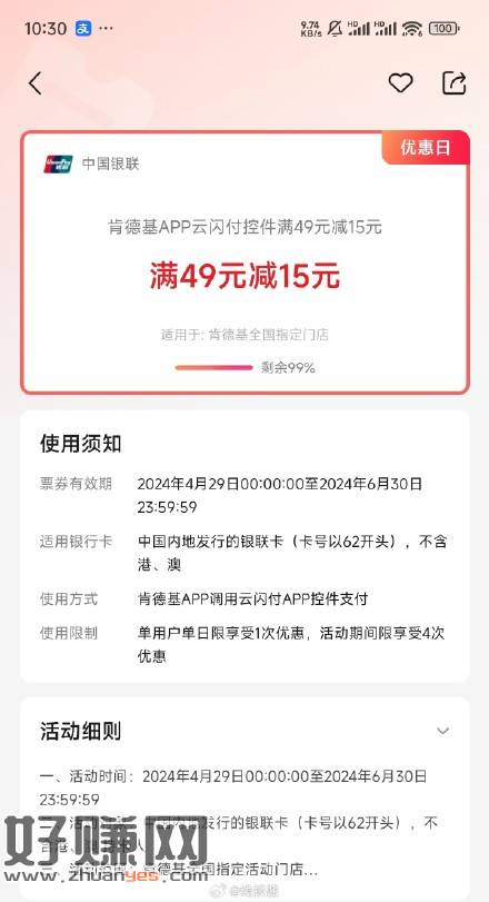 截止6.30,肯德基App调转云闪付有49-15,日限1次,活动期间4次
