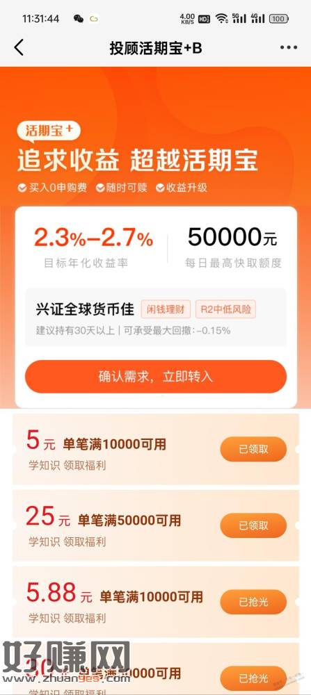 来个活期宝投顾的满减券,里面是50%债基 货基