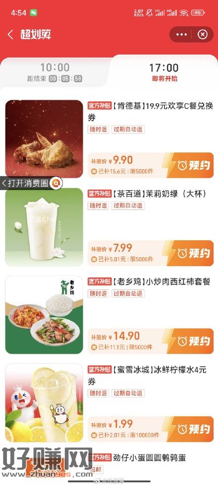 17点,支付宝消费圈,超划算大牌低价点进去,有1.99蜜雪,9.9肯德基
