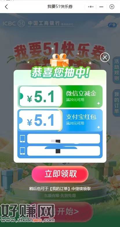 抽奖领工行微信支付宝20-5.1