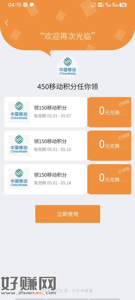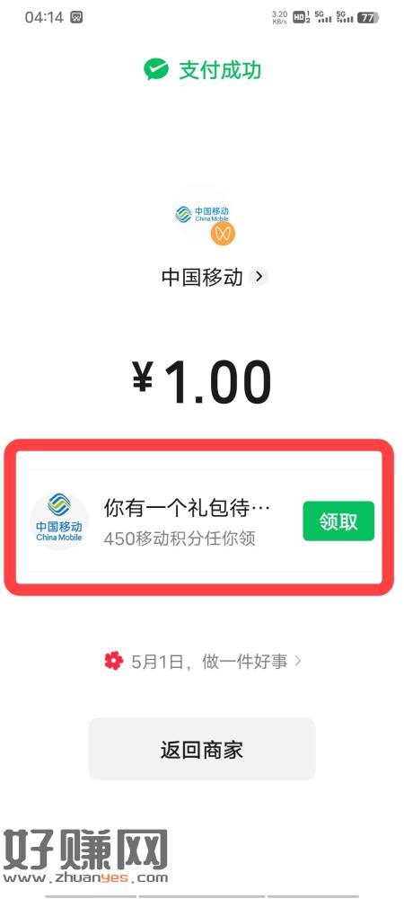 移动app-自定义充值1元话费(部分人最低10)选择微信支付-支付完成后会显示 领取了去打卡领150 第2 第3天 从下面入口进去打开即可