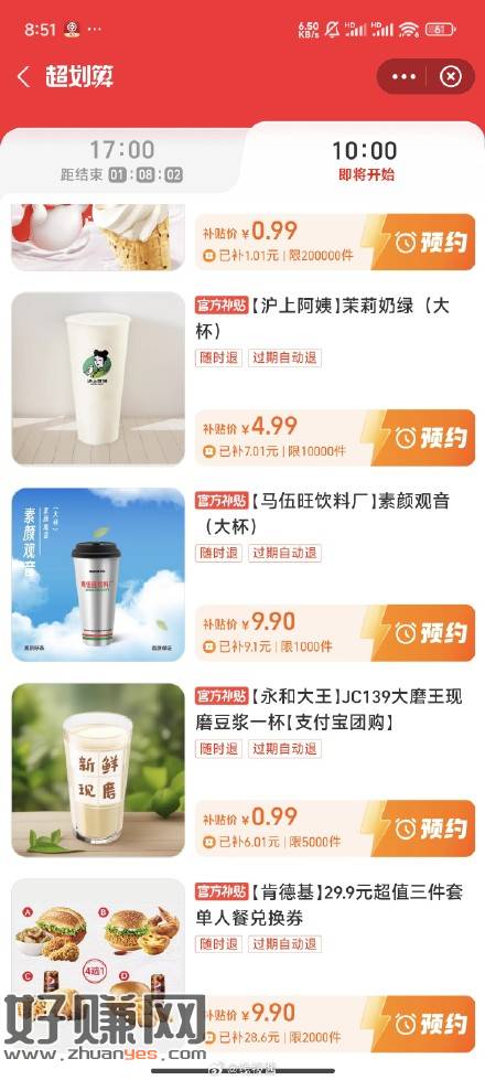 10点,支付宝消费圈,超划算大牌低价点进去,有0.99蜜雪永和4.99沪上阿姨,,9.9肯德基