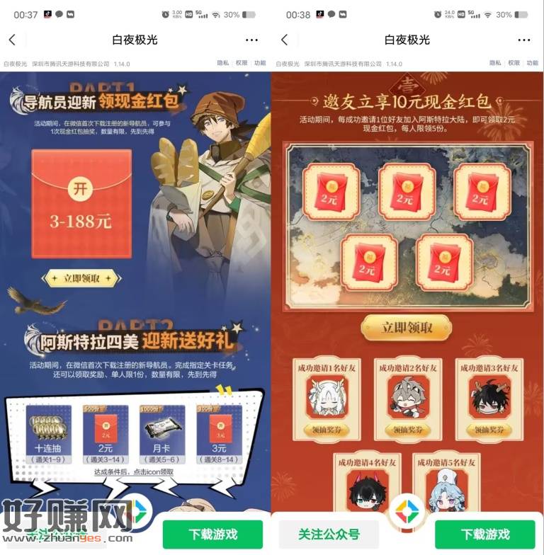 白夜极光微信新用户领3-188元红包,和邀请好友领2-10元