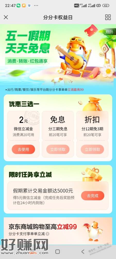 分分卡五一假期活动领福利3选1,没有领取的吧友记得领取,五一假期达标5000可以再领5立减金