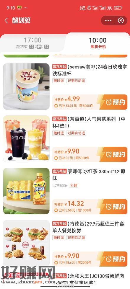10点,支付宝消费圈,超划算大牌低价点进去,有蜜雪肯德基等