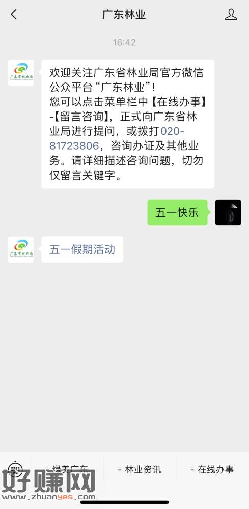 1:微信公众号:广东林业,发送:五一快乐,有三次机会