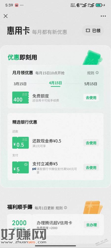 微信支付xing/用卡还款里面惠用卡领浦发500-5支付立减卷
